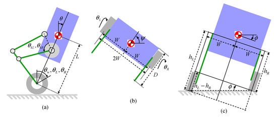 When the ground is rough or the robot’s legs are not of equal length, the FRBC is designed to control the WBR and maintain its horizontal posture and height by adjusting the length of its legs. Due to the hardware limitation, the WBR’s leg length cannot be extended or shortened indefinitely. In the proposed WBR, the length of its legs can be adjusted between mm and mm through the realization of a four-bar linkage. When the leg length of the WBR is within the limitation, the FRBC is designed for posture control, and when the leg length of the WBR is on the limitation, the FRBC is designed for height control. First, considering the robot height is between and , the FRBC is designed to control the WBR to maintain its horizontal posture. In the posture controller design, a rolling sliding index is designed as: