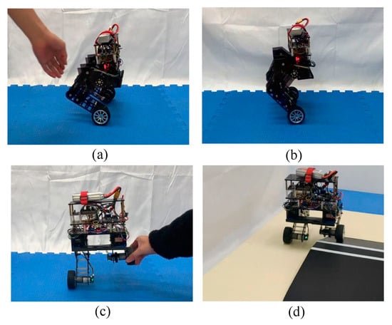 The robustness of the IMBC system was tested when one wheel was slightly off the ground. The purpose of the experiment was to test whether the leg strategy controller could maintain the robot’s height when it was disturbed by human hands. The experiment was performed by lifting the right foot of the WBR by hand at approximately the 2nd second and putting it down at approximately the 6th second, and then lifting the left foot of the WBR by hand at approximately the 12th second and putting it down at approximately the 16th second. The experimental results of the posture-keeping scenario are shown in Figure 9a,b for the cascade PID control [] and the IMBC system, respectively. They show that the proposed IMBC system can maintain the horizontal posture of the WBR during the leg lifting process, and when the single leg on one side of the leg lift reaches its limit, the other side can be extended or retracted to compensate for the error of the horizontal angle. Because the cascade PID controller cannot independently control two leg motors to change the robot’s attitude, the horizontal posture of the WBR cannot be maintained during the leg lifting process.
