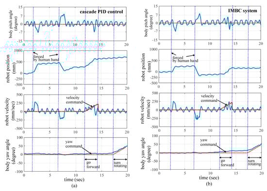 In this scenario, the WBR started by balancing in its initial posture at the setting height and staying at the setting height. The tests were then carried out, including self-balancing, station-keeping, anti-interference, moving, and rotating tests. The experiment was performed by executing three actions to demonstrate the flexibility of the WBR. Two external forces were pushed on both sides of its body by human hands at approximately the 3rd and 6th second. The WBR was then ordered to go forward for 3 s at the 12th second and turn right in place for 3 s at the 17th second. The experimental results of the moving and rotating scenario are shown in Figure 7a,b for the cascade PID control [] and the IMBC system, respectively. These figures show that both the cascade PID control and the IMBC system are sufficiently robust against external disturbances and can perfectly perform tasks such as moving and rotating in place while maintaining good balance.