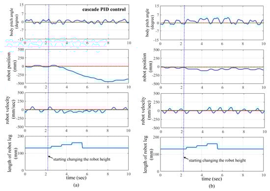 In this scenario, the WBR started balancing in its initial posture at the minimum height. The experiment was performed by increasing the height of the robot to the maximum height starting at approximately the 2nd second and then changing the height of the robot to the minimum height at approximately the 4th second. The experimental results of the height-changing scenario are shown in Figure 8a,b for the cascade PID control [] and the IMBC system, respectively. It can be seen that when the robot height command is changed, the length of both legs increases or decreases at the same time. Comparing Figure 8a,b shows that the WBR was able to stay in place without generating significant motion when using the proposed IMBC system. However, when using the cascade PID control, the robot could not stay in its original position, owing to the change in height of its center of gravity. This result demonstrates that the proposed IMBC system can effectively overcome the effects of system uncertainties caused by robot height variations.