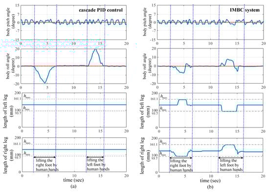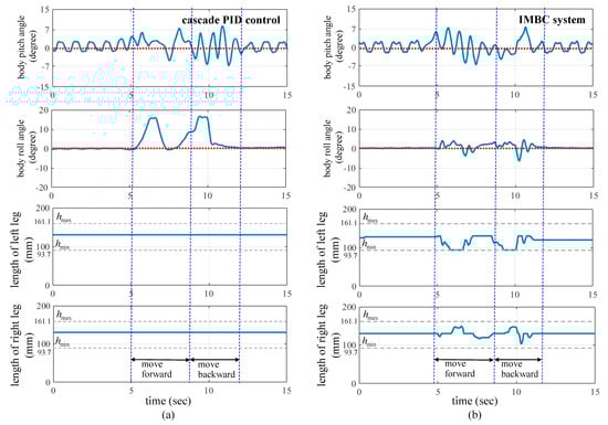 The WBR moved on a small slope of approximately 12° on one side and 8° on the other side, with the left leg on the small slope and the right leg on the flat ground. The purpose of the experiment was to test whether the leg strategy controller could keep the robot horizontal when it was disturbed by terrain. The experiment had the robot move forward at approximately the 5th second with the left foot on the ramp but the right foot on the ground and then move backward to its original position at approximately the 7th second. The experimental results of the posture-keeping scenario are shown in Figure 10a,b for the cascade PID control [] and the IMBC system, respectively. These results show that the proposed IMBC system can adjust the height of the left and right legs in time to avoid the robot falling over as a result of a change in height of the left and right leg positions. However, the cascaded PID controller cannot adjust the height of the left and right legs independently, so when the WBR is disturbed by terrain changes, its balance can easily fail.