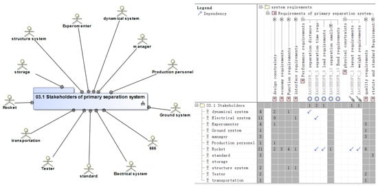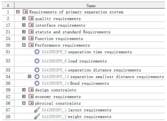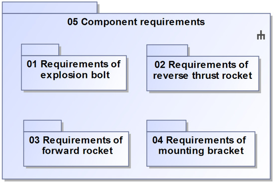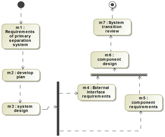 The process of requirements analysis and modeling based on MBSE is as follows: first, we should capture requirements in three ways. One way is to identify the stakeholders to check who proposed the requirements, as shown in Figure 2. The second way is to define the life cycle process to check when the requirements were proposed, as shown in Figure 3. The third way is to design the scenario to check where the requirement was proposed, as shown in Figure 4. The stakeholders’ model, lifecycle process model, and use case model are baselined for requirement analysis. as shown in Figure 2, Figure 3 and Figure 4. Secondly, once the requirements are fully captured, the requirements should be itemized and standardized, following the industry standard specification. Thirdly, any functional requirements should be checked, and the performance of the function should be evaluated. Through the functional requirements comparison matrix with performance requirements, there are some performance requirements figured out. For example, tall functions in the first-stage separation system need to work safely under complex force constraints such as the first-stage engine thrust, the second-stage engine thrust, the electrical connector pull-out force, and the trachea pull-out force, etc. In order to validate and verify the requirements of safety separation, the minimum separation gap should be quantitively defined according to the experience or design mechanism. Through the continuous iteration of the above process, 58 requirements for the first-stage separation system were finally formed and can be used as the design basis for the separation system, as shown in Figure 5.