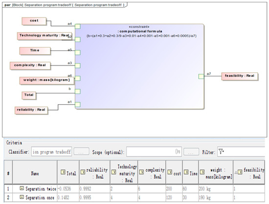 Firstly, the top-level functionality is obtained based on the system requirements, and the functional architecture is defined. When analyzing the operational scenario for the top-level functionality, there are two alternative logical architectures. One is separation once the other is separation twice. Based on the effective criteria, these two alternatives are traded off quantitatively, and then the proposal of separation once is better than the other, which is shown in Figure 6 and Figure 7.