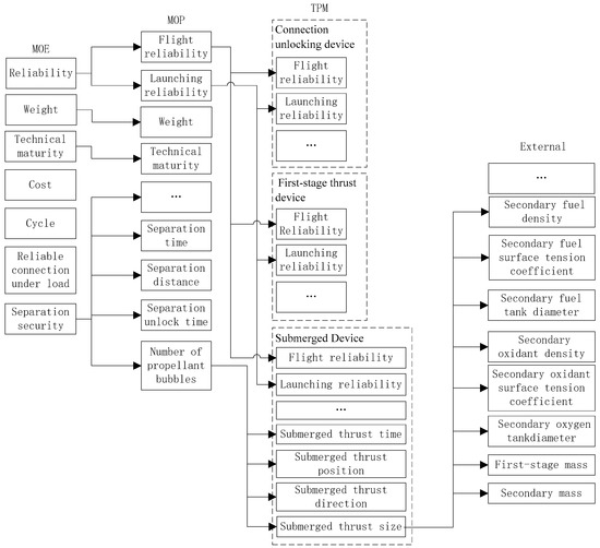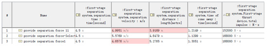 To design the first-stage separation system of the launch vehicle, we should identify the measure of effectiveness (MOE) from the system requirements. MOE includes the reliability, weight, cost, and safety separation. etc. Then, MOE should be transformed into the measure of performance (MOP), which should be baselined for the index allocation. For example, the safety separation should be refined by the separation time, separation gap, and so on. Finally, all the MOP should be allocated to technical performance measures, which could be allocated to logical components. The index flows down from MOE to MOP and from MOP to TPM is complicated because of the complicated system, as shown in Figure 8. Anyway, there are three core parameters, such as the connection forces to combine the first and second stages of the rocket, the thrust force to throw away the first sub-stage, and the push force to ensure that the secondary propellant sinks to the bottom. There are still several alternatives for the parameter flowing down from the top level to the low level. The system engineer would build the evaluation criteria and then select the best alternative through trade-off analysis. Finally, the core parameters are calculated, as shown in Figure 9. Additionally, the three core parameter values are as follows: