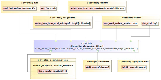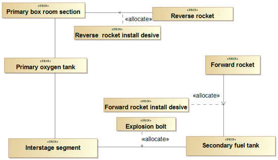 The specific modeling process is as follows: create a physical architecture model according to the logical architecture and establish a model of the inheritance relationship from the physical architecture to the logical architecture. First, a trade-off analysis of the implementation of the separation forces is carried out. By the quantitative trade-off analysis of the pneumatic connection unlocking device, explosive bolts, and linear connection unlocking device, the explosive bolts are chosen as the final solution. Then, the trade-off analysis of the types of explosive bolts is carried out, including the BLS-300C24-1 explosive bolt and BLS-300C24-2 explosive bolt. After quantitative trade-off analysis, BLS-300C24-1 is selected. After a series of analyses, the first-stage separation system physical architecture scheme is determined, as shown in Figure 11. Finally, the physical architecture design is completed by defining the physical interface model.