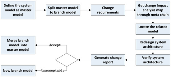 With t, the integrated system model, we can build the requirement change impact analysis process to support the system design, as shown in Figure 12. This integrated system model is split into two models. One model is the master model, and the other is the branch model. The branch model supports the requirement change analysis. Once the requirement is changed, the change impact domain analysis map is figured out through the meta-chain in the branch model. It is easier and quicker to locate the chain between the changed requirements and the related model elements, such as the architecture design model, verification model, and so on. Then, the related models are redesigned. Moreover, the verification model is simulated again, as shown in Figure 13. Compared with the master model and branch model, the change report is generated for the system engineer. Based on these two results analyses, the changed requirements and new system architecture are decided to be acceptable or not. If the change is accepted, the branch model will be merged with the master model, as shown in Figure 12 and Figure 13.