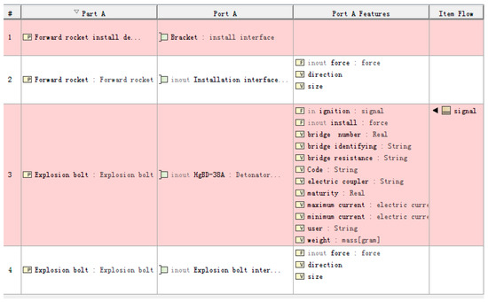 The integrated system model is a full-feature model which includes the system design process and system definition. Different stakeholders from different viewpoints can obtain various design view models from this system model. In the design process of the separation system, the interface control document, component requirements, flight procedures, system layout, etc., can be generated from the system model automatically, as shown in Figure 14, Figure 15, Figure 16 and Figure 17.