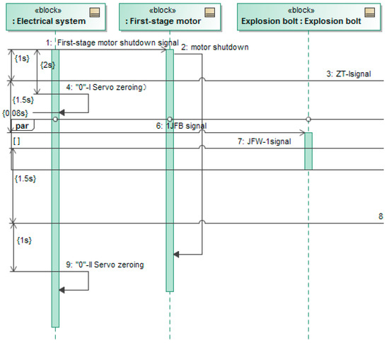 By integrating specific functions and assigning them to the logical entities and logical interfaces, the logical architecture of the first-stage separation system can be built, which is shown in Figure 10, and all of the indexes have been allocated to each logical component. As a result, the interfaces and parameters of the logical architecture will be determined. Hence, the logical architecture is shown in Figure 10.