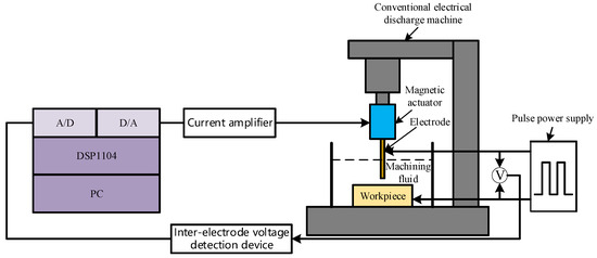 Figure 3 shows the block diagram of the inter-electrode voltage control system of the magnetic actuator for micro-EDM, which is a voltage closed-loop control. The inter-electrode voltage signal is detected by the average voltage detection device and used as the feedback signal of the control system. The feedback voltage between the inter-electrode and the given reference voltage is sent to the controller for processing. The output voltage signal of the controller obtains the control current on the coil of the magnetic actuator through the power amplifier and completes the movement of the electrodes of the magnetic actuator. Through the closed-loop control system, the inter-electrode voltage can be controlled near the ideal machining voltage, which increases the probability of normal discharge, thereby effectively improving the efficiency of micro-EDM.