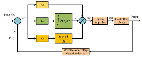 Figure 4 shows the structure diagram of the conventional PID controller. In Figure 4, Vr(t) is the target value, which is the desired value of the inter-electrode voltage of the micro-EDM. Vs(t) is the feedback value, which is the current value of the inter-electrode voltage of the micro-EDM. e(t) is the input signal of the PID controller, which is the difference between the feedback value of the inter-electrode voltage of the EDM and the desired value of the inter-electrode voltage. Kp is the proportional adjustment coefficient. Ki is the integral adjustment coefficient. Kd is the differential adjustment coefficient. u(t) is the output signal of the PID controller. I(t) is the value of the coil control current of the magnetic actuator.