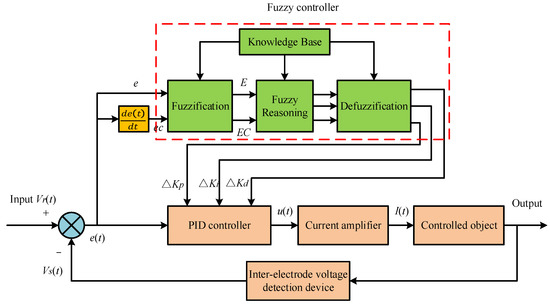 The fuzzy controller consists of four main modules: the fuzzification module, fuzzy reasoning module, knowledge base module and the defuzzification module [26,27]. Figure 5 shows the schematic diagram of the inter-electrode voltage control system of the fuzzy PID control magnetic actuator for micro-EDM.