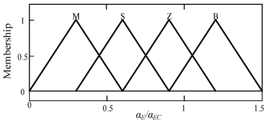In the domain adjustment mechanism, the two input variables of the fuzzy control system are the inter-electrode voltage error e and its rate of change ec, and the fuzzy domains E and EC of the input variables are both set to (−6, 6), and the fuzzy subset linguistic values of the fuzzy control system input variables are expressed as (negative large (NB), negative medium (NM), negative small (NS), zero (ZO), positive small (PS), positive medium (PM), and positive large (PB)). The contraction-expansion factors to adjust the contraction-expansion change of the input domain are αe and αec, respectively. Then, the fuzzy domains αE and αEC are both (0, 1.5), and their fuzzy subset linguistic values are all expressed as (medium compression (M), light compression (S), keep constant (Z), light expansion (B)). The contraction-expansion factors that adjust the output domain contraction-expansion change are βp, βi, and βd, respectively, then the fuzzy domains βP, βI, and βD are all (0, 2), and their fuzzy subset linguistic values are all expressed as (large compression (CB), medium compression (CM), small compression (CS), keep constant (Z), small expansion (AS), medium expansion (AM), large expansion (AB)). The variable domain fuzzy PID controller is established using MATLAB/Simulink, and the membership function can be selected in the fuzzy control module. Since the triangular membership function has higher sensitivity, it is chosen to use the triangular membership function, as shown in Figure 6 and Figure 7, for the membership functions of the input domain contraction-expansion factors and the output domain contraction-expansion factors, respectively.