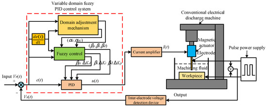 Electrical discharge machining (EDM) is not limited to the strength and hardness of conductive materials, and is a non-contact special processing technology. In micro-EDM, there are problems such as untimely axial positioning, unstable inter-electrode machining voltage, and difficulty in discharging inter-electrode electric erosion products. This paper considers a magnetic actuator with fast response and high accuracy as the local actuator for a micro-EDM. By introducing a domain adjustment mechanism, a variable domain fuzzy PID controller was designed to control the inter-electrode voltage control system of the magnetic actuator for micro-EDM using an intelligent control strategy. During the micro-EDM machining process, the controlled magnetic actuator drives the tool electrode in the axial direction for rapid micro-positioning, thus maintaining effective inter-electrode machining voltage and achieving a high-speed and high precision EDM. Simulation and experimental results showed that compared with traditional micro-EDM, the machining efficiency of the variable domain fuzzy PID control magnetic actuator, and traditional micro-EDM cooperative control, was increased by 40%, the machining process was more stable, and the quality of the machined surface was better.