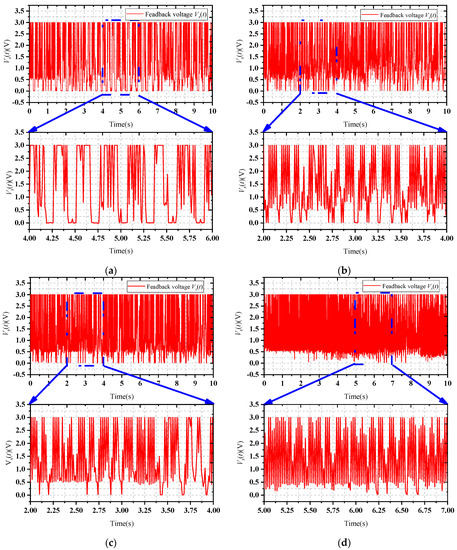 To monitor the discharge status in real-time during EDM of micro small holes, the inter-electrode voltage detection circuit detects the feedback voltage Vs(t), which is then used for data acquisition by a digital signal processor (dSPACE1104). The feedback voltage is 0 V when the short-circuit is discharged. When the discharge state is a broken- circuit, the feedback voltage is 3 V, and the actual inter-electrode voltage is 90 V. And the effective discharge range is within the range of 20% (0.6 V) to 80% (2.4 V) of the broken-circuit inter-electrode voltage. Figure 12 shows the inter-electrode feedback voltage diagram for the four machining cases. Comparing the above four machining cases, it can be seen that the variable domain fuzzy PID controlled magnetic actuator can better reduce the number of short-circuit and broken-circuit of the gap voltage and be more sensitive to the short-circuit and broken-circuit, thus effectively improving the EDM efficiency.