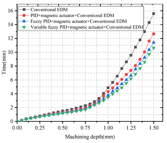 Figure 13 shows the relationship between the micro EDM depth and machining time for the above four machining cases. Analysis of the curve in the figure shows that the machining speed slows down with the increase of machining depth. The reason is that when the machining depth is less than 1mm, the machined small hole is very shallow, the machining electric erosion products are easily discharged, and the electric erosion products removal effect has little impact on the machining efficiency. However, when the EDM depth of micro-hole is greater than 1mm, the electric erosion products removal becomes more and more difficult, and the machining electric erosion products cannot be discharged in time, resulting in low EDM machining efficiency. The magnetic actuator can drive the electrodes in the axial direction (Z direction) for rapid micro-positioning, which can effectively change the state of inter-electrode discharge and promote the removal of inter-electrode electric erosion products. In conclusion, the variable domain fuzzy PID control is more effective for this control system, the control system is more stable, and the machining efficiency is higher.