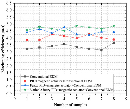 To further observe the effect of the inter-electrode voltage control system of the magnetic actuator for micro-EDM on the machining efficiency, four groups of small holes with a depth of 1 mm were machined in the above four machining cases. The machining speed of eight small holes was selected as sample data for each group of experiments. Figure 14 shows the comparison of machining efficiency.