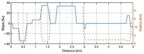 The values of the slope and R depend on the line profile and the position s of the train on the line and are, therefore, known at each time. Figure 1 shows as an example of the value of the slope and R used in this work.