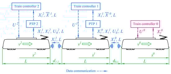 With the proposed control strategy, the leader will track a given speed curve, and the followers will guarantee a safe minimum distance between trains and the string stability of the VCTS with parameter uncertainties. Consequently, as seen in Figure 2, the follower needs information about the preceding train to ensure its safety. This information ( and ) is used by the follower’s controller for its calculations because the predicted states for the preceding train are calculated using the PTP embedded in each follower based on the information received from the preceding train.