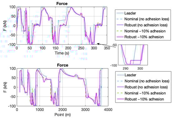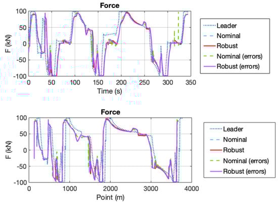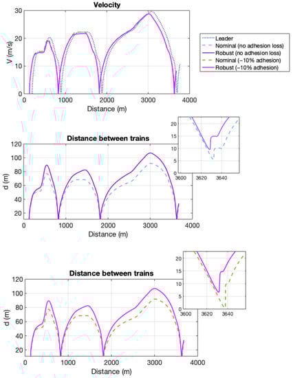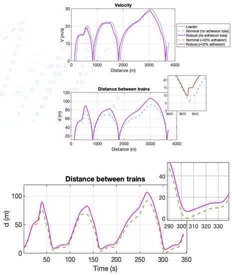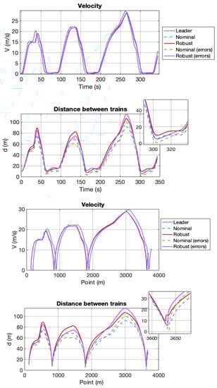 The upper plot in Figure 4 represents the time–velocity curve and shows the speed of the leader, which is the same for both the nominal and robust controllers. Moreover, in acceleration (i.e., the increasing parts of the curves), the leader has a slightly higher velocity than the followers, thus increasing the distance between the trains. However, in braking (i.e., the decreasing part of the curve), when the velocity of the leader decreases, the follower becomes closer as it has a higher speed, always maintaining the safe distance imposed by the constraints. It is also possible to observe the stop at the stations.