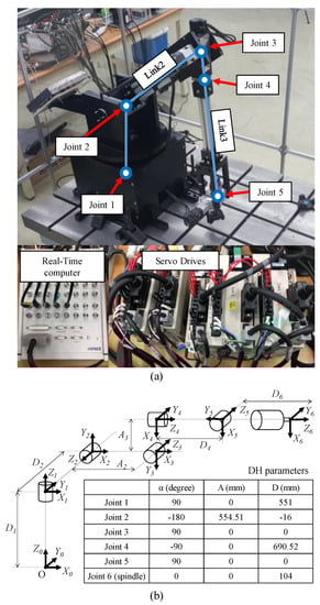 Figure 3a shows the experimental setup of the five-DOF robot arm. The payload of the robot arm was set to 50 N. The rated torque of the joint motors with reducers was designed based on the load torque applied to each joint. Joints 1 and 2 comprised a motor with a rated torque of 2.39 Nm (SGMAV-08A, Yaskawa) and a reducer with a gear ratio of 1/100 (PGX90-H100, ATG). Joint 3 comprised a motor with a rated torque of 1.27 Nm (SGMAV-04A, Yaskawa) and a reducer with a gear ratio of 1/100 (PGX62-H100, ATG). Joints 4 and 5, with relatively low loads, both had a rated torque of 0.159 Nm (SGMAV-04A, Yaskawa) and reduction gears (PGX44-H100, ATG) with a gear ratio of 1/100. Links 2 and 3 were each constructed with aluminum profiles measuring 40 mm × 80 mm and 40 mm × 40 mm, respectively. Figure 3b shows the Denavit–Hartenberg (DH) parameters, which represent the joint dimensions and relative angle of the robot processing system. Joints 1, 2, and 3 determine the position of the robot, whereas joints 4 and 5 determine the orientation of the robot. The designed five-DOF robot arm was installed on the surface of a plate table.