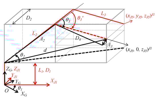 where and are derived by (, 0, )J1 and the DH parameters, respectively. The angular position of joint 3 () is the sum of the angle between and , and , which denotes the angle between and .