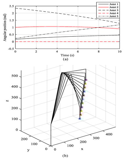 Simulation result with respect to the initial position of (300 mm, 0 mm, 100 mm) to the target position of (500 mm, 200 mm, 300 mm), maintaining the target orientation as (0, 0, −1): (a) target angles of joints 1 to 5 generated in the numerical control kernel and (b) posture of the robot arm.