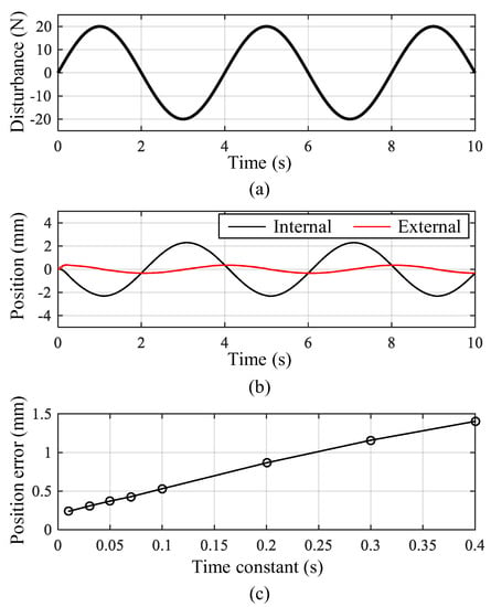 Simulation result of the dual-position feedback controller with sinusoidal wave disturbance: (a) disturbance; (b) position of the end effector measured by internal and external position sensors; (c) peak position errors of the end effector with respect to the time constants of the dual-position feedback controller.