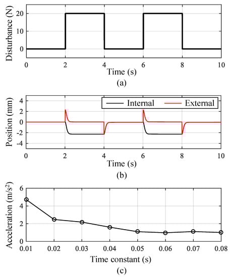 Simulation result of the dual-position feedback controller with square wave disturbance: (a) disturbance; (b) position of the end effector measured by internal and external position sensors; (c) peak acceleration of the end effector with respect to the time constants of the dual-position feedback controller.