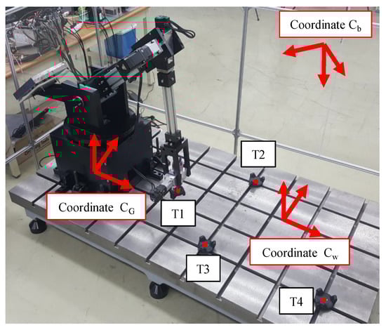 An external position sensor (Vive, HTC) was installed to measure the actual contour error of the end effector. Figure 8 shows the three Cartesian coordinates (Cb, Cw, and CG) used to calculate the actual position and contour error of the end effector. Cb is the coordinate of the Vive base station. The Vive acquires the three-dimensional position of the trackers with respect to the coordinates of the base station. The accuracy of the position measurement was 0.1 mm in our experimental setup. Cw and CG denote the coordinates of the worktable and robot arm, respectively. The actual position of the robot arm was measured by attaching a tracker (T1) to the end effector; subsequently, it was converted to the worktable coordinate using a homogeneous transformation matrix (HTM). The HTMs of the worktable and base station coordinates were derived from the unit direction vectors of the worktable coordinates measured by three trackers (T2, T3, and T4) installed on the worktable. The target position of the robot arm was generated in the worktable coordinate and converted to the robot arm coordinate for position control. The contour error was calculated based on the target and actual positions of the end effector in the worktable coordinate. The HTMs of the robot arm and worktable coordinates were derived from the unit direction vectors of the robot arm coordinates calculated by measuring the position of tracker T1 when the robot was linearly moving along the x, y, and z axes.