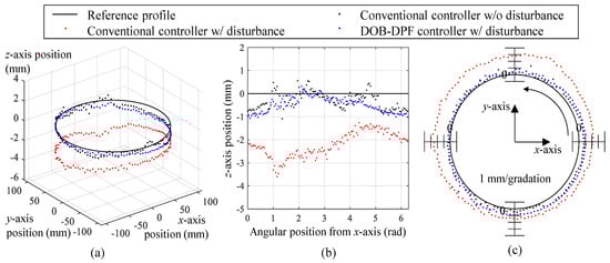 To evaluate the performance of the DOB-DPF controller, its contour errors were compared with those of a conventional controller comprising a feedback and feedforward module during circular interpolation. The trajectory of the robot arm was set to a circle with a radius of 100 mm in the xy plane of the worktable coordinate. Figure 9 compares the contouring performances of the two controllers before and after a constant weight of 2.2 kg was applied to the end effector. Figure 9a,b show that the position drop of the end effector caused by a significant weight reduction when the DOB-DPF controller is applied. The peak, root mean square (RMS), and standard deviation (STD) of the contour errors are listed in Table 1. The RMS value of the contour error of both the conventional and DOB-DPF controller was 0.59 mm when the external disturbance was zero. When a weight of 2.2 kg was applied to the end effector, the contour error of the conventional controller increased to 2.30 mm, whereas the contour error of the DOB-DPF controller increased to 0.71 mm. This result indicates that the contour error caused by the disturbance was compensated for by the DOB-DPF algorithm.