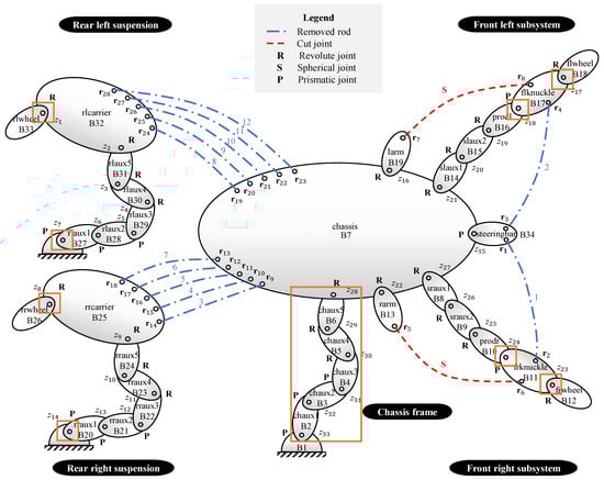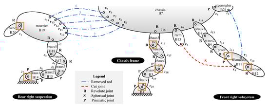 where and denote the VDIFs and external forces of the original vehicle system, respectively. Vectors and represent the additional VDIFs and external forces of the removed suspension lower-arm, respectively. Vectors , , , and denote the VDIFs and external forces resulting from the two removed rods, acting on point j in the steering knuckle. Vectors , , , and represent the VDIFs and external forces acting on points k and l in the chassis.