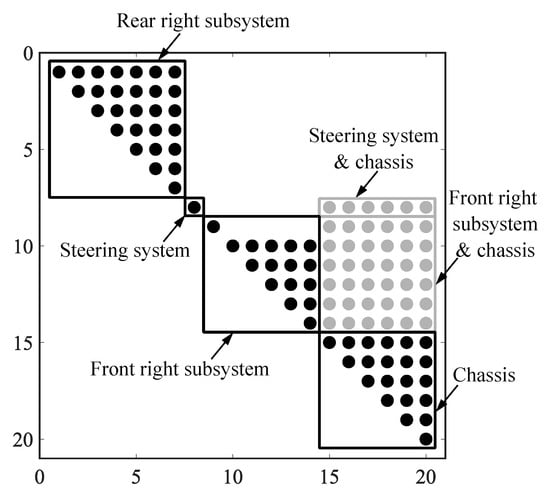 where , , , and denote the effects on the diagonal elements of the mass matrices of neighboring bodies ( chassis and steering knuckle). Matrices , , , and represent the effects on the coupling elements of the mass matrices of neighboring bodies.