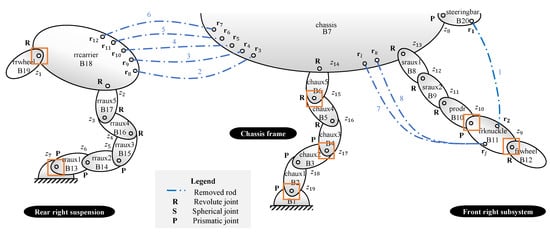 where and denote the total forces of the removed lower-arm acting on the point j, corresponding to the two removed rigid rods. Note that the fork-arm removal technique is represented by removing two rigid rods. Vectors and denote the total forces of the removed lower-arm acting on the points k and l in the chassis, respectively.