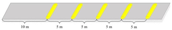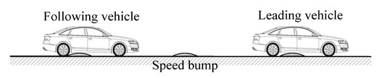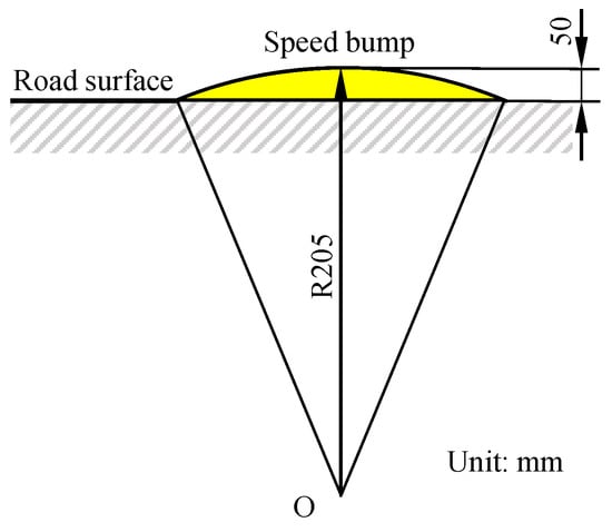 We use speed bumps to simulate a continuously bumpy road. They range in width from 300 mm to 600 mm and in height from 30 mm to 60 mm. The 50 mm or 60 mm high arc-shaped bumps have superior speed-control effects [39]. Five continuous speed bumps are integrated into the roadway’s profile. The details of the bumpy road are depicted in Figure 7 and Figure 8.