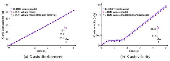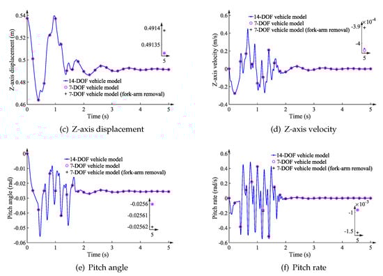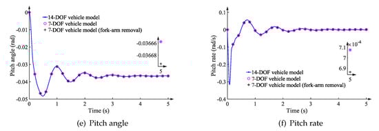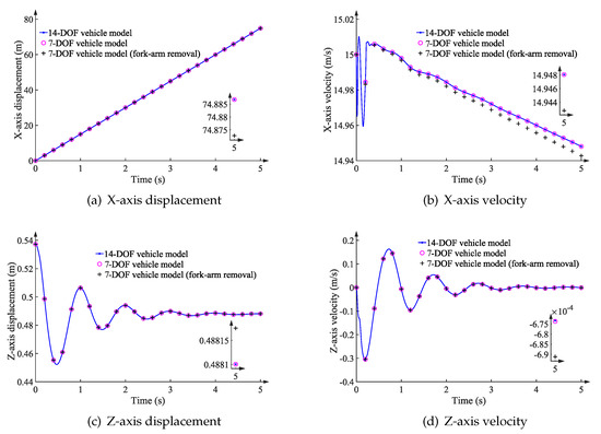 On each front wheel, a 300 Nm driving torque is applied, and the initial speed is 20 m/s. The simulation lasts 5 s and the time-step is 1 ms. Following dynamic simulations, the X- and Z-axis displacement and velocity, as well as the pitch angle and rate, are obtained for precision analysis. We compare the results of the proposed vehicle model with and without the fork-arm removal technique to those of the 14-DOF vehicle model (reference data). The comparative outcomes are depicted in Figure 9.