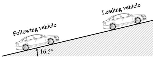 This section simulates a sloping road, which is a common driving environment for autonomous vehicles. Figure 10 depicts a road environment with a typical slope angle of 16.5°. An initial velocity of 15 m/s is used, and a 1550 Nm driving torque is imposed on the front wheels. For intelligent control to perform forward collision avoidance, adaptive cruise control, and platooning, in this ADAS environment, calculating the following vehicle’s states in real-time is anticipated. In addition, the vehicle’s vertical responses can be controlled to reduce vibration for improved riding quality.
