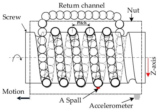 A basic ball-screw assembly consists of four main elements: the screw, the nut, the balls, and the recirculation channel, as shown in Figure 2. Mechanical components that have rolling contacts, e.g., ball bearings and ball-screws, are subjected to normal degradation due to rolling-contact fatigue (RCF). RCF can be defined as a mechanism of crack initiation and propagation caused by the near surface alternating stress (i.e., cyclic loading forces) within rolling contact, which eventually leads to material removal, such as spall and pit defects [9].