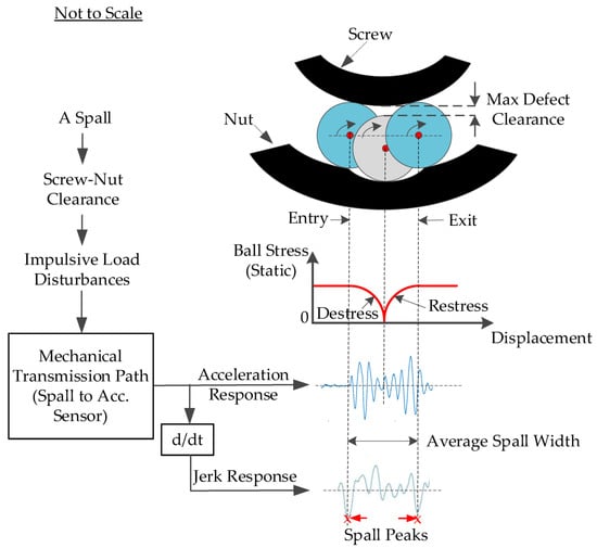 The mechanisms of inducing vibration transients due to the rolling element movement within ball-screw assembly are discussed in [10]. When a spall fault is initiated, a radial clearance at the spall zone (i.e., between the rolling element and the defective nut or screw races) causes impulsive disturbances at the instant of entry into the spall zone, followed by a second disturbance at the instant of exit from the spall zone, as shown in Figure 3.
