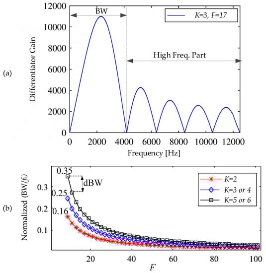 The frequency response for the SGD involves two parts (Figure 4a). The first is an ideal differentiator to the input signal and it is denoted as the useful differentiation bandwidth (BW). The second is a noise amplification band for the high frequencies beyond the BW. The SGD parameters (K, F) can be tuned to select a specific BW, as shown in Figure 4b. This tuning is crucial for separating a certain BW that is most likely excited by the fault features (i.e., entry/exit instances). A procedure for such a tuning is provided in Section 2.3. A basic characteristic of SGD is that the evolution of F is identical for all K and (K + 1), as investigated in [14]. The selection K is a tradeoff between two performance metrics, namely, the BW searching range and its resolution. A larger searching range, by increasing K, is necessary for the consideration of a wider frequency spectrum for the vibration signal, while a smaller BW resolution (dBW), by decreasing K, is useful for incorporating smaller changes in the spectrum due to fault entry/exit instants. The dBW in Figure 4b describes the BW step-change in terms of F. Based on several numerical simulations, the setting K = 3 provides the best balance between the searching range and the bandwidth resolution.