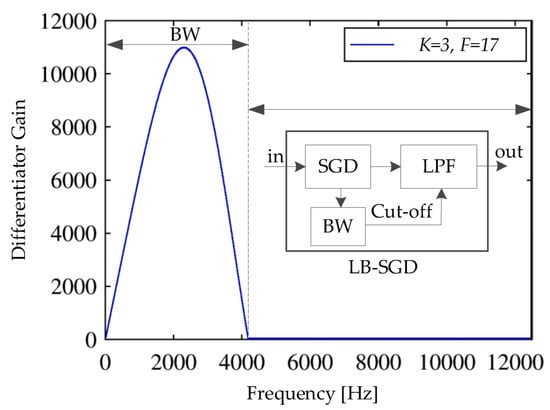 The SGD tuning can be used to adjust the useful differentiation bandwidth. However, the high frequencies of the input signal are always subjected to significant amplification as they are located outside the BW. In order to overcome this deficiency, a modified, narrow-bandwidth SGD (MSGD) is proposed in this paper. A typical SGD is cascaded with a low-pass filter to eliminate all high frequencies outside the BW, as shown in Figure 5. This filter can be effectively realized by using a fast Fourier transform (FFT)-based low-pass filter (LP-FFT), as described in [15]. The cut-off frequency for the low pass filter equals to the useful differentiation bandwidth, the BW value.