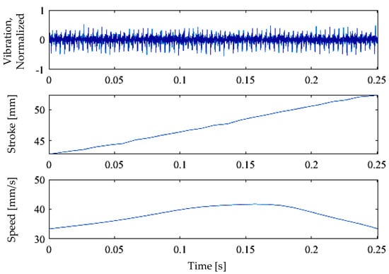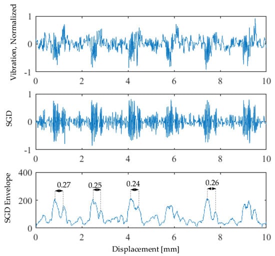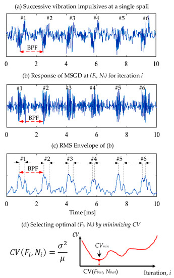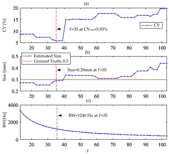 The following quantification example is for dataset no. 2, as shown in Figure 9. The quantification processing is shown in Figure 10. Figure 10a shows the parameter search based on the minimum CV at K = 3 and F = 1:105. The search result (Figure 10b,c) indicates F = 35 at (CV = 5.93% and BW = 1240 Hz), which corresponds to an average entry–exit length of 0.29 mm with 3.3% error level. Figure 11 shows an example of short time acceleration transients that are subjected to numerical differentiation, MSGD signal, and its RMS envelope. More detailed quantification conditions and examples are described in [16].