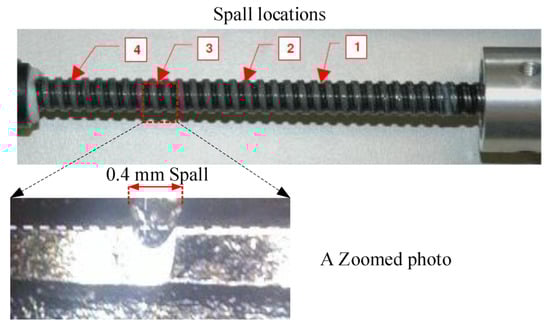- A spalled ball-screw typically generates high frequency transients (e.g., impulsive) on the acceleration response (Figure 6a) when a ball crosses a spalled zone. These transients are separated by the ball pass frequency (BPF), as described in [10].