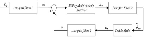 Combining sliding mode control methods with filters enables filtering of noisy signals, providing a smooth signal for the sliding mode controller. The structure of a low-pass filter-based sliding mode controller control system is shown in the following diagram [,], where  is input for control,  is output for control. To reduce jitter generated by the sliding mode controller, the low-pass filter is designed as follows: