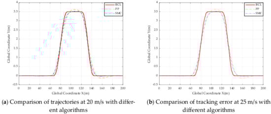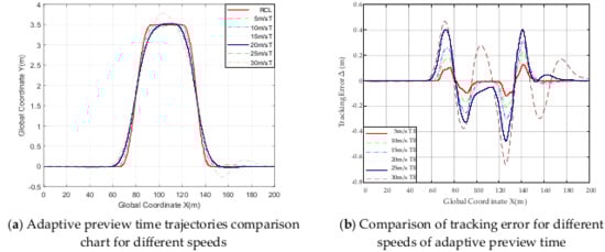 The analysis of Section 2 and Section 4 is neglected because the reference is the centerline of the road at the location at that time. The differences between the peak point of the trajectory and the road centerline at each of the three locations on the road section at different speeds are 0.0313 m, 0.0289 m, 0.0265 m and 0.0312 m (from 5 m/s to 20 m/s, at 5 m/s intervals); the differences between the point at Global Coordinate X = 95 m and the road centerline at different speeds are −0.0124 m, −0.0481 m, −0.0864 m and −0.1679 m; and the differences between the point at Global Coordinate X = 120 m and the road centerline at different speeds are −0.0017 m, −0.0254 m, −0.0435 m and −0.1639 m. From these data above, as the speed of the vehicle continues to increase, the maximum offset and the minimum offset in Section 3 increases and the tracking effect of the controller gradually diminishes. It can be seen that at speeds of 5–20 m/s, the maximum offset from the road centerline on Section 3 does not exceed 0.0320 m and the minimum offset from the road centerline on Section 3 does not exceed 0.1680 m. This shows that the tracking effect of the sliding mode controller based on adaptive preview time is good when road adhesion coefficient is 0.5.