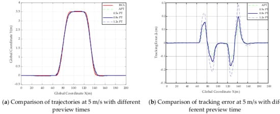 Comparison of trajectories and tracking error with different preview times at 5 m/s.