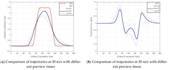 Comparison of trajectories and tracking error with different preview times at 30 m/s.