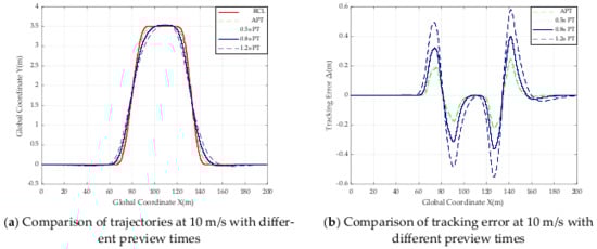 Comparison of trajectories and tracking error with different preview times at 10 m/s.