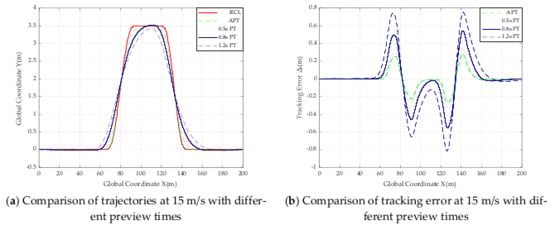 Comparison of trajectories and tracking error with different preview times at 15 m/s.