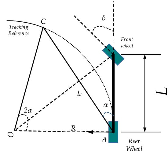 The ideal steering wheel turning angle is decided by the expectation-based method [], and a constant transverse pendulum angular velocity assumption is made, as shown in Figure 2. The predicted trajectory is treated as a circle with point E as the center and radius R, and the angle of the center of the circle is θ.