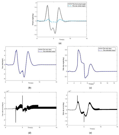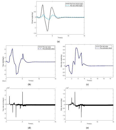 Figure 2a shows curves of the front and rear wheel angles of the vehicle when driving under double lane change conditions. The curves of yaw rate and side slip angle are shown in Figure 2b,c, respectively. It can be seen from Figure 2b,c that the designed observer can well estimate the yaw rate and side slip angle when the vehicle is driving on an ordinary road surface, and they finally stabilize at zero. Figure 2d,e shows the error curves of the yaw rate and side slip angle, respectively.